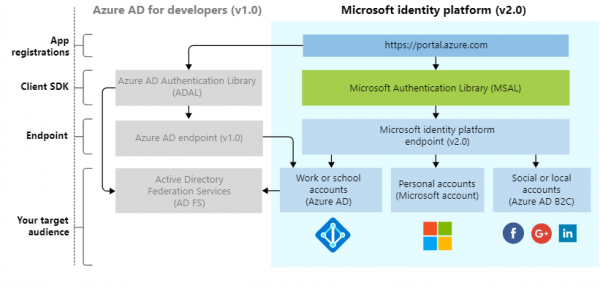 Die Microsoft Identity Platform unterstützt alle wichtigen Industriestandardprotokolle wie OAuth 2.0 und OpenID Connect. Mit dem Vorgängerlösung (Azure AD v1.0) konnten Entwickler nur MS-Organisationskonten durch Anfordern von Token mithilfe der Azure AD Authentication Library (ADAL) via Azure-Portal, der Azure AD Anwendungsregistrierung/-konfiguration oder der Microsoft Graph API für die programmgesteuerte Anwendungskonfiguration authentifizieren.