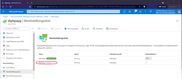 Wurde der Slot erstellt, wechseln Sie mit einem Klick auf den entsprechenden Link zu Ihrer testing-app (hier „diphpapp-testing“). Achten Sie auf der Übersichts-Seite darauf, dass nun auch links oben der Name des Slots und der App angezeigt werden, hier „testing (diphpapp/testing)“.