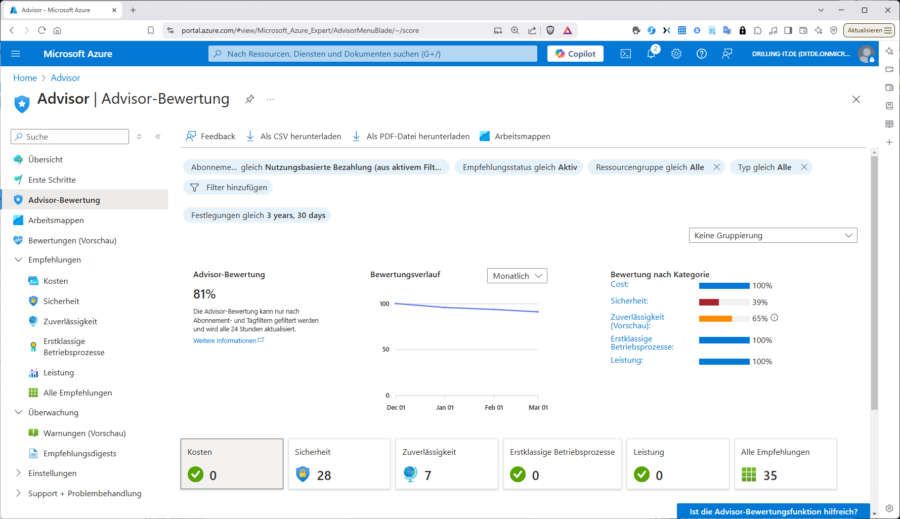 Ein Anlaufpunkt dazu ist das Service-Health-Dashboard im Azure Monitor der Abschnitt „Integritätsempfehlungen“.