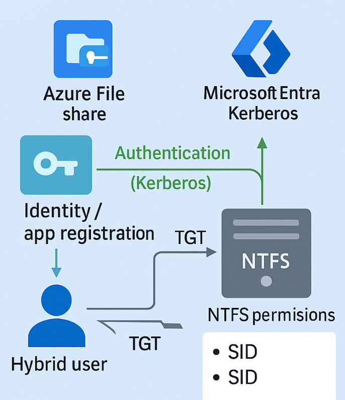 • Das Feature Microsoft Entra Kerberos ersetzt hier den klassischen AD-KDC für den Zugriff auf Azure Files.