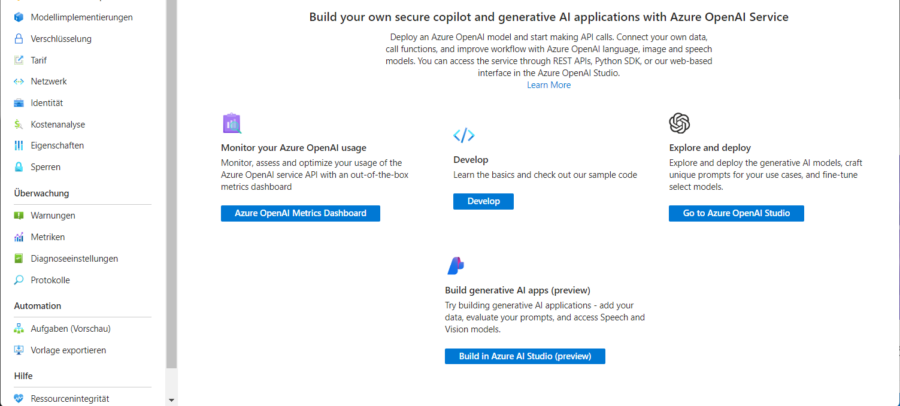 Je nach Bedarf wird im Abschnitt „Netzwerk“ ausgewählt, ob ein Zugriff auf die OpenAI-Ressource z. B. aus dem Internet möglich sein soll. Für dieses Beitrag erlauben wir den öffentlichen Zugriff und erstellen die Ressource. Alternativ ließe sich eine AOAI-Ressource auch mit Hilfe der Azure-CLI erstellen. Nach der Erstellung navigieren wir zur Übersichtsseite der OpenAI-Ressource.