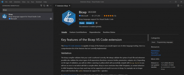 Um möglichst effizient mit Bicep arbeiten zu können, sollte man dafür sorgen, dass die Umgebung für das Entwickeln und Bereitstellen von Bicep-Dateien geeignet ist. Am besten eignet sich dazu Visual Studio Code mit der entsprechenden Bicep-Erweiterung. Diese bietet neben der prinzipiellen Sprachunterstützung automatische Vervollständigung für Ressourcen. Für die Integration genügt es, in den VS Code Extension nach „Bicep“ zu suchen und auf „Installieren“ zu klicken.