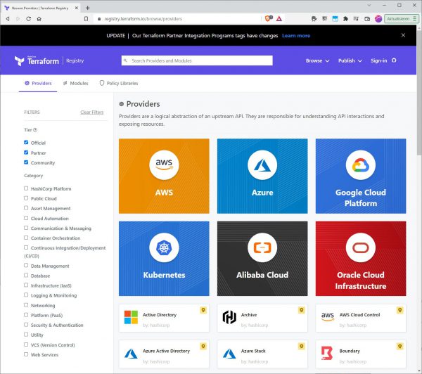 Unschwer zu erkennen ist in Zeile 1, dass man einen Terraform Resource Provider für Azure benötigt. Dieser heißt „azurerm“. Auf der Terraform-Registry-Seite ist zu erkennen, dass Terraform zahlreiche Provider für die unterschiedlichsten Partner-Lösungen zur Verfügung stellt.