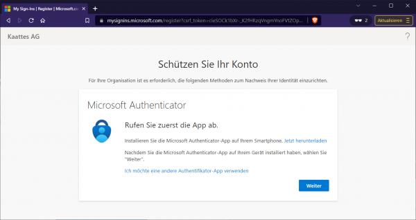 Jeder neue Benutzer im Azure AD muss mithin MFA verwenden. Dazu gehört, dass er nach der Account-Erstellung seine bevorzugten Sicherheitsmethoden implementieren muss. Er hat dafür lediglich 14 Tage Zeit. Klickt der Benutzer in diesem Dialog hingegen auf Weiter, dann muss er mit Hilfe der App Microsoft Authenticator einen zweiten Faktor konfigurieren.