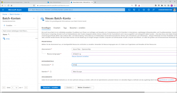 Um erste Workloads mir Azure Batch erstellen zu können, ist ein grundlegendes Verständnis für die beteiligen Konzepte Batch-Konto, Knoten und Pools sowie Aufträge und Aufgaben vonnöten. Zunächst wird ein Azure-Batch-Konto benötigt. Darunter versteht Microsoft eine eindeutig identifizierbare Entität innerhalb des Batch-Diensts. Da die weitaus meisten Batch-Lösungen Azure Storage zur Speicherung von Ressourcen- und Ausgabedateien nutzen, ist jedem Azure Batch-Konto in der Regel ein entsprechenden Speicherkonto zugeordnet. Die Zuordnung kann bereits beim Anlegen des Batch-Account erfolgen. Pro Region ist es möglich, ein Batch-Konto anzulegen.