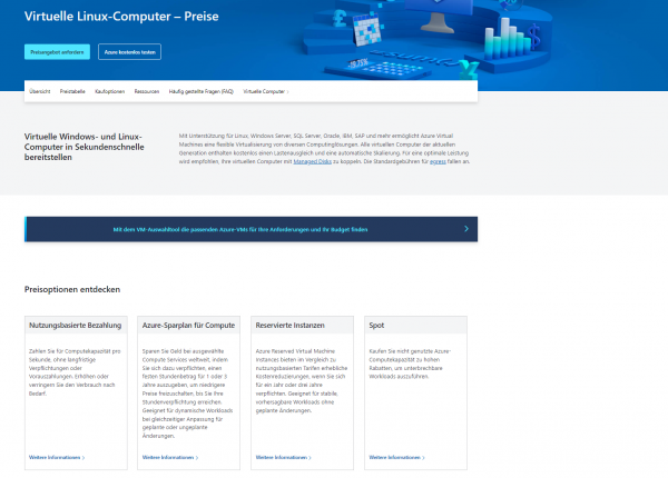 Sie können mit dem Azure Kostenrechner Beispielrechnungen für zahlreiche unterstütze Azure-Services durchführen. Nur selten wird eine in Azure gehostete Applikation nur aus einem einzigen Service bestehen. Doch selbst wenn Sie sich bewusst auf virtuelle Maschinen beschränken und sich z. B. von der Azure-Preisübersicht hierher verlinken lassen, zeigt Ihnen der Preisrechner zwar oben rechts einen Preis an, der auf ihrer getroffenen Hardwareauswahl basiert, Sie müssen sich aber darüber im Klaren sein, das das nicht der monatliche Endpreis ist, mit dem Sie Ihre VM effizient betreiben können.
